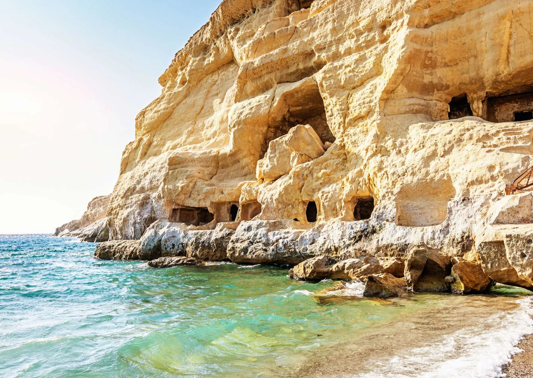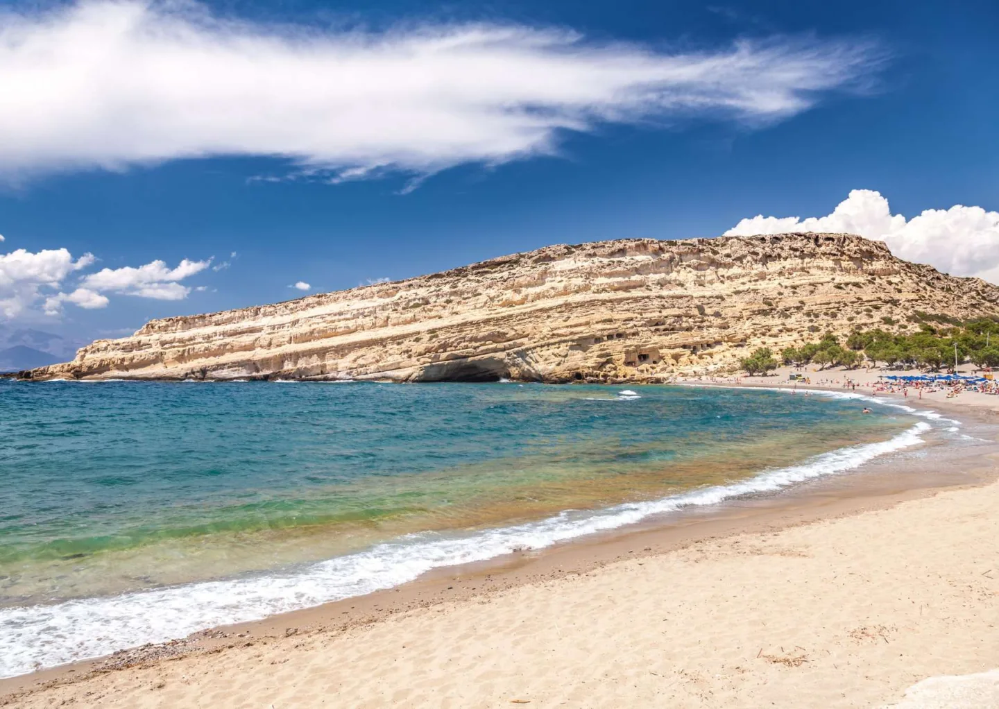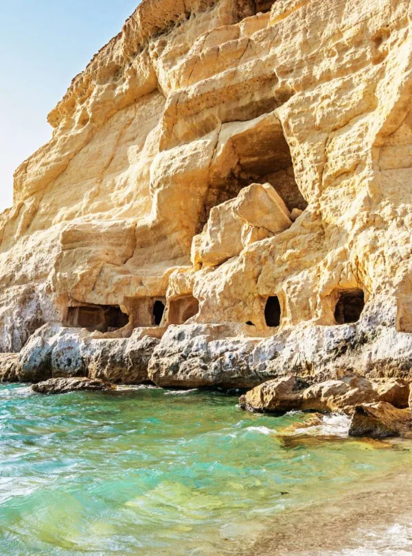Dopo la colazione, parti in direzione sud verso il Mar Libico. La tua destinazione è Matala, uno dei luoghi più iconici di Creta. Celebre per le sue grotte scavate nella roccia, un tempo tombe romane e poi rifugio della comunità hippie negli anni ’70, Matala conserva ancora oggi un’atmosfera libera e creativa. Dopo il check-in in hotel, avrai tempo per rilassarti tra mare cristallino, spiagge dorate e tramonti spettacolari. Pernottamento a Matala.